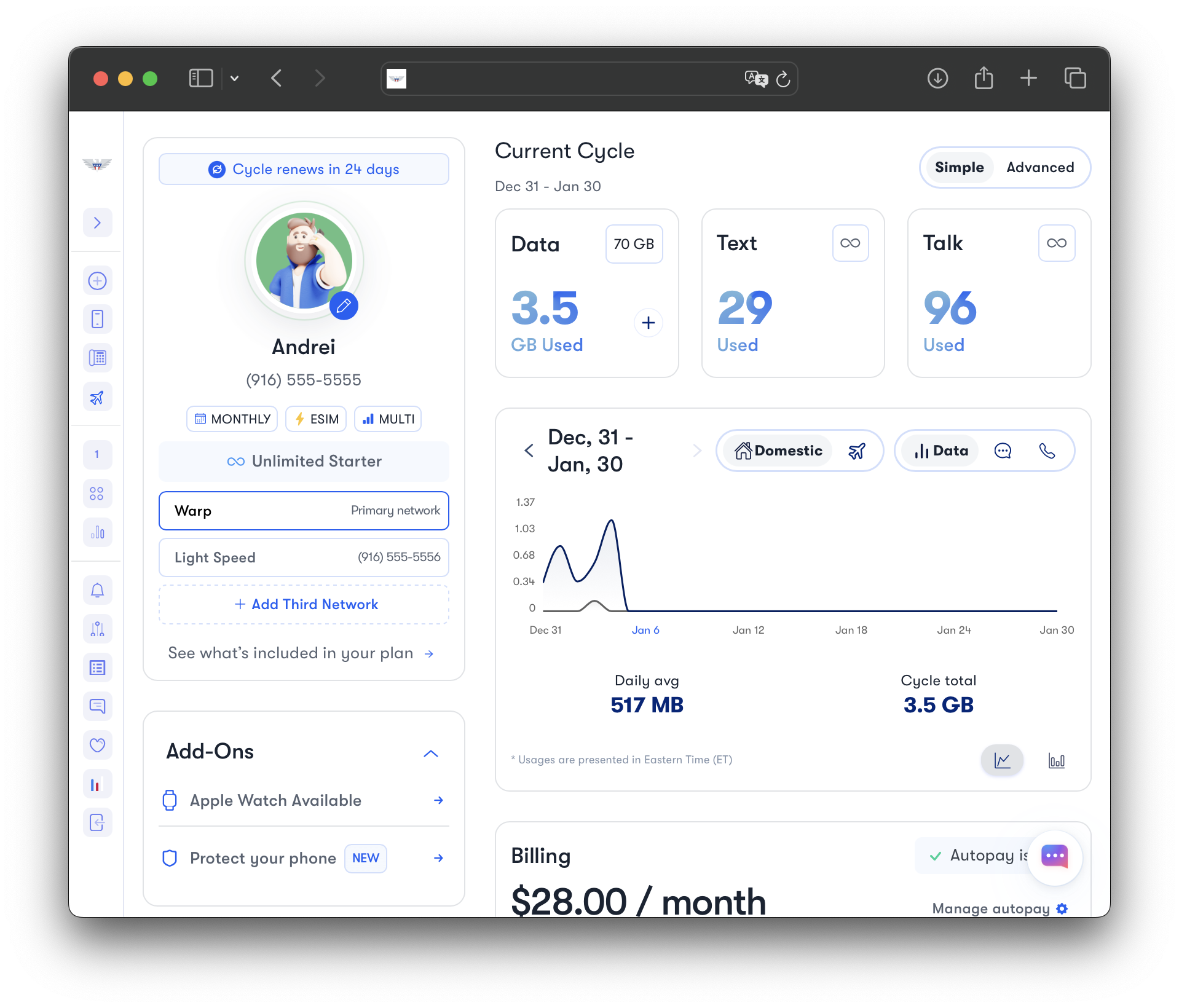 Я использую тариф Starter ($25) + опцию международных звонков ($3), а также Multi-network ($10). За всё это я плачу $38 в месяц, что, я считаю, весьма неплохо. Для сравнения Visible за $25 в месяц предоставляет 5G без поддержки Ultra Wideband, без международных звонков и с множеством других ограничений. Кроме того у Visible доступна только одна линия на каждый аккаунт, а значит 2 линии обойдутся уже в $50, без возможности как-то оптимизировать расходы.