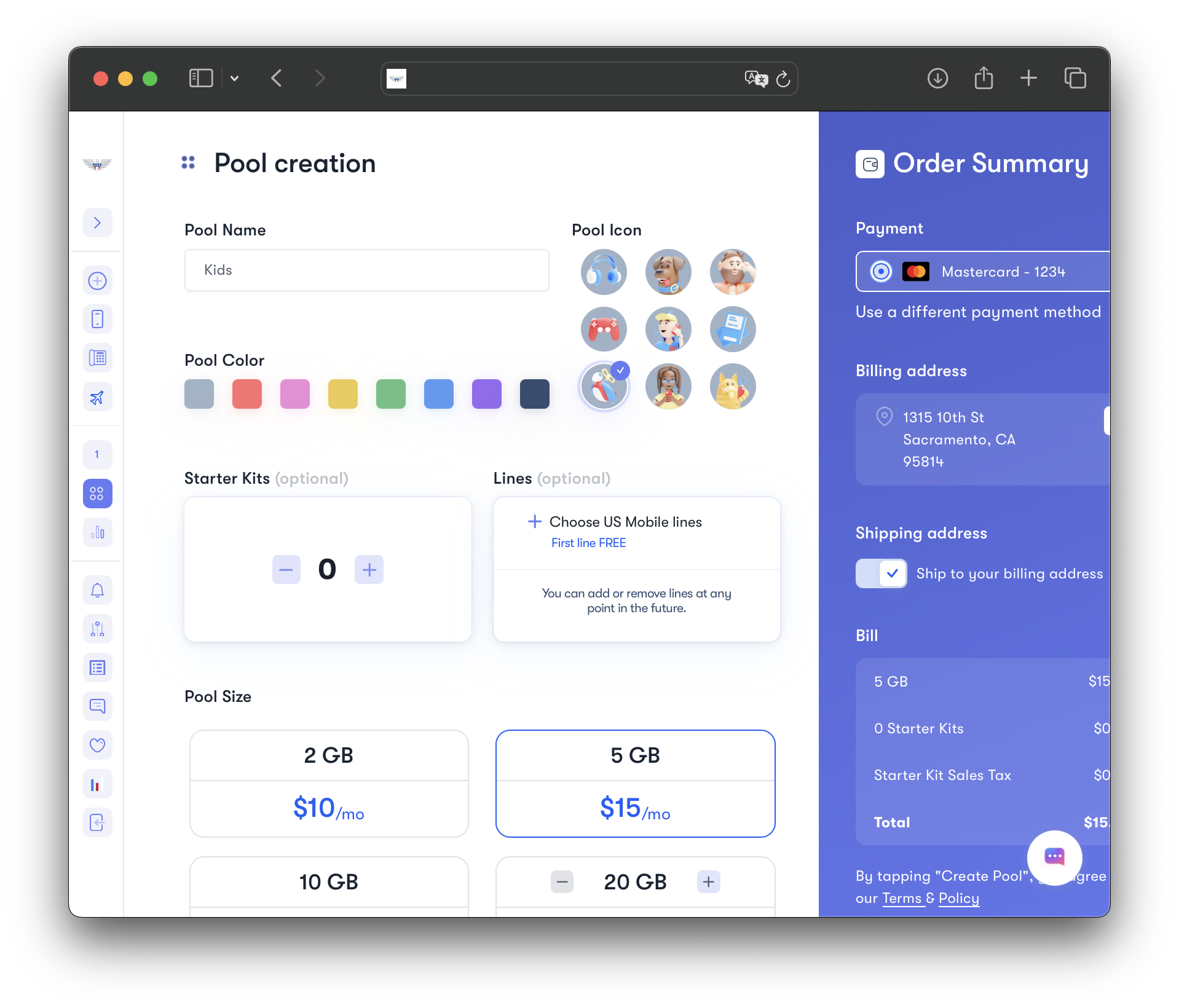 Пул — это группа линий, которые совместно используют общий пакет трафика. Первая линия в пуле бесплатная, каждая следующая — $8 в месяц. Для пула необходимо выбрать стартовый размер пакета трафика, при исчерпании пакета можно докупить ещё трафика. Стоимость пакетов такая же как в тарифе By the Gig